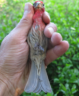 A sure sign this is a young Northern Cardinal (pictured below) is a brown bill. As summer moves into fall the bill gradually becomes orange and will be completely orange by winter or following spring. The red body feathers growing in indicate a male. Cardinals are notorious for hurting when they bite. Some net extractors will give the cardinal a stick to chomp down on while taking them out of the net. My husband Bill claims he can tell a young bird from an adult because the young will hold on to the stick and the adult knows the difference between wood and a finger and isn’t fooled by that trick for too long!